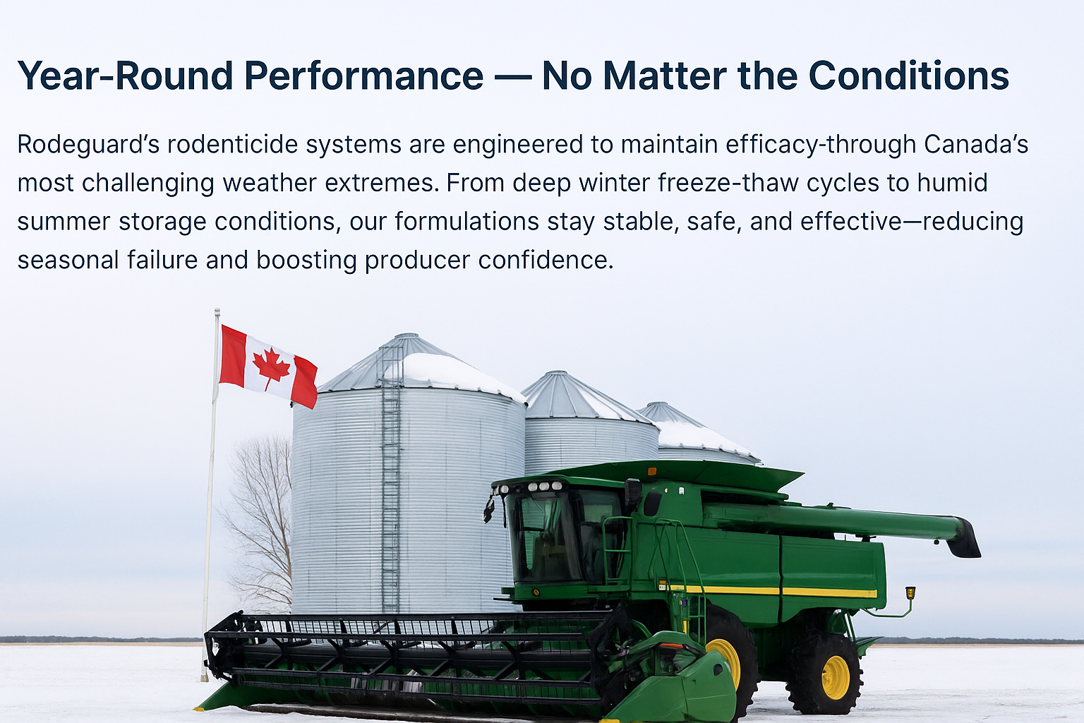 We develop our rodenticide systems to perform reliably through the full spectrum of Canadian agricultural conditions. From extreme cold to high humidity, each formulation is built to remain stable, effective, and dependable—regardless of the season or storage environment.